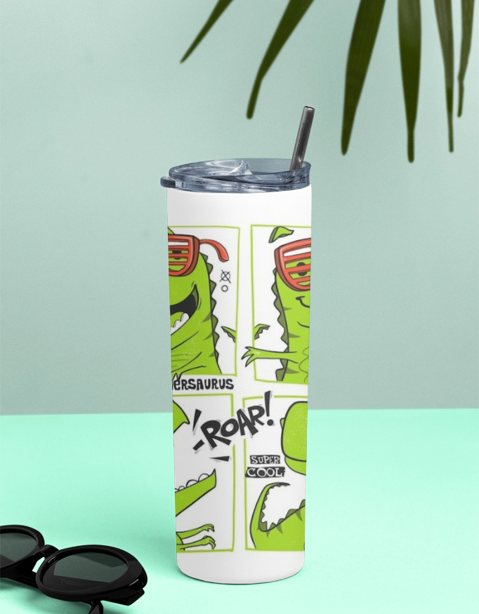 Turn hydration time into fun time with this Cool Dino Comic Edition Stainless Steel Tumbler! Designed with a playful dinosaur in bright green shades, red sunglasses, and comic-style frames, this tumbler adds a burst of personality to your everyday routine. Featuring bold text like “ROAR!” and “Super Cool!”, it’s a hit for kids, teens, and anyone who loves quirky, energetic designs.