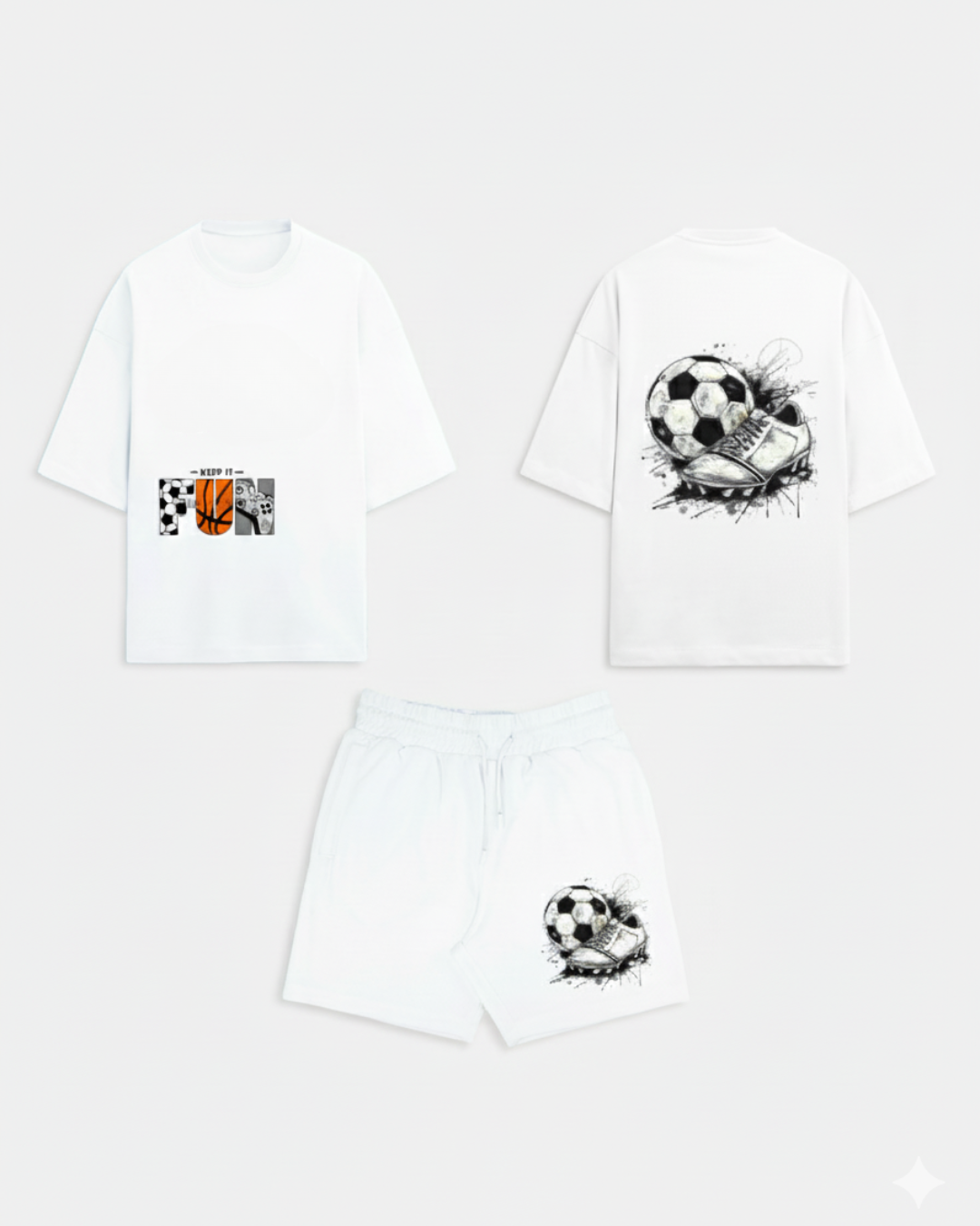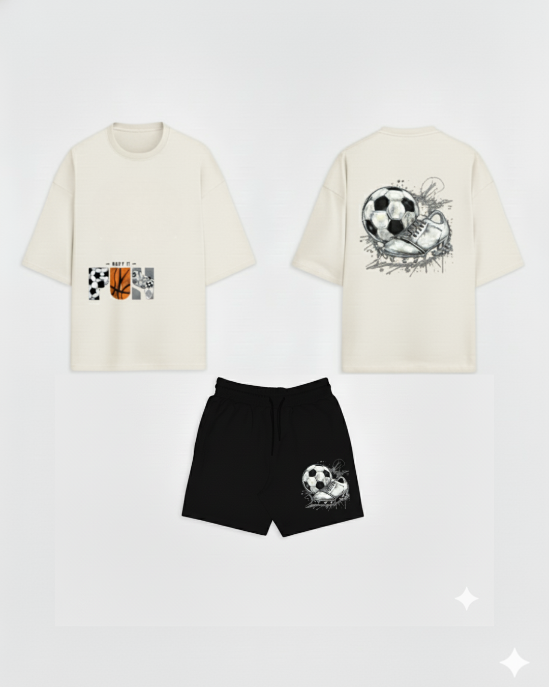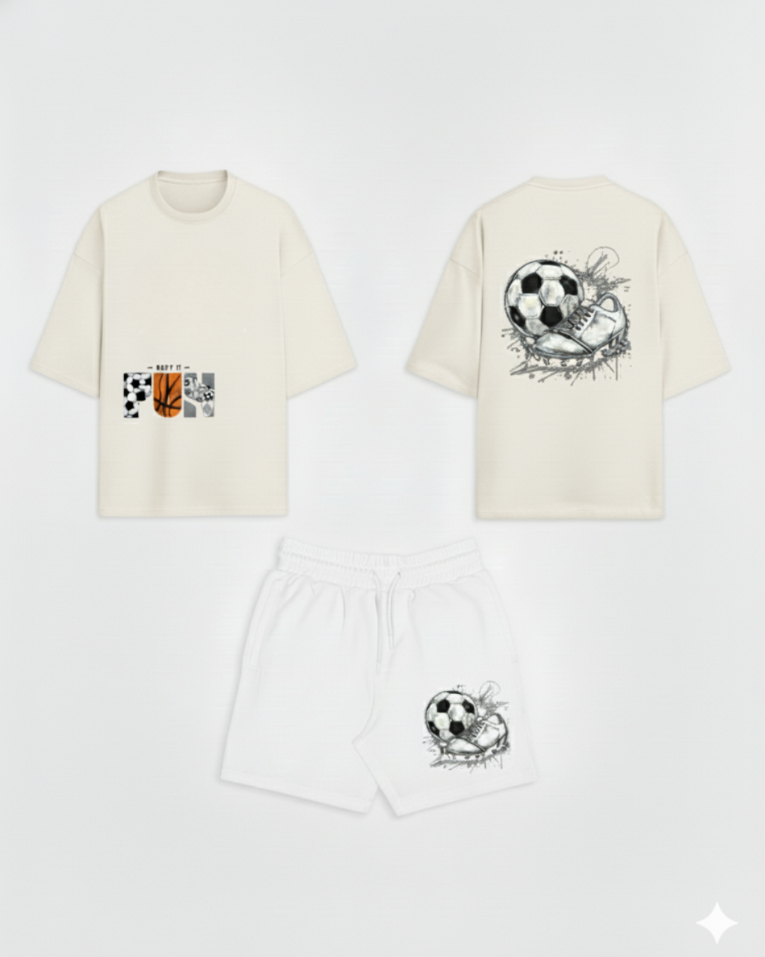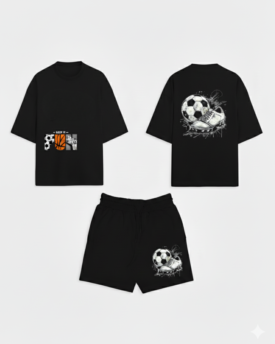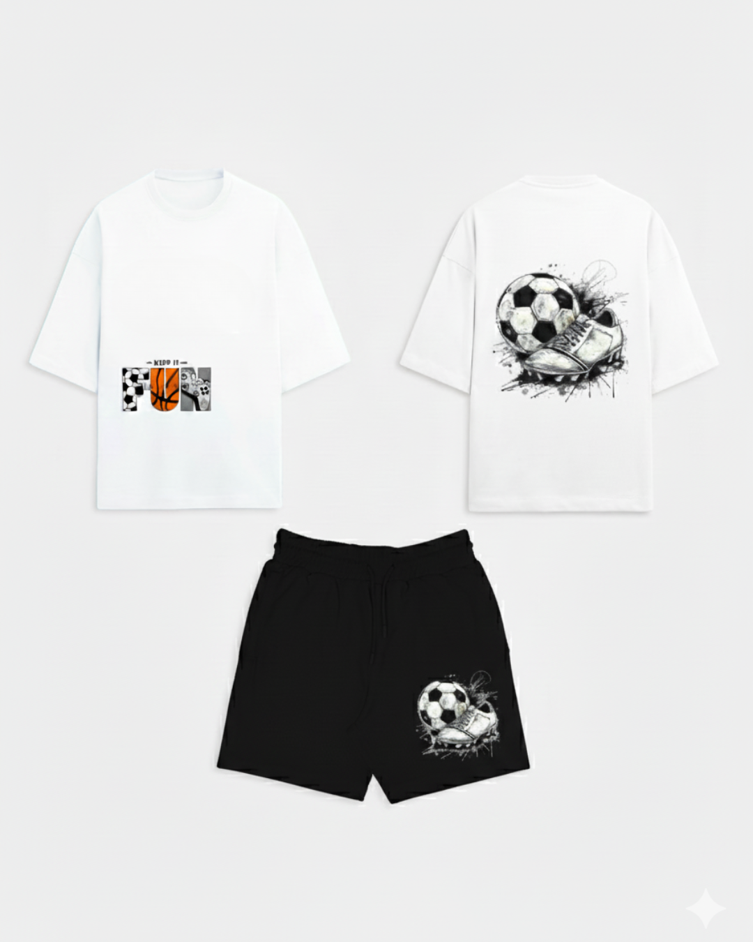 The off-white tee features a minimal “KEEP IT FUN” graphic over the pocket on the front, while the back boasts a dynamic design of a soccer ball being struck by a cleat—a true statement of passion for the game. Paired with lightweight black mesh shorts covered in a subtle, repeating soccer ball pattern, this set is built for action.