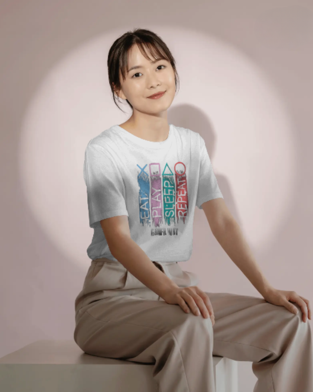 The front features vibrant controller-inspired graphics with the iconic gamer mantra “Eat. Play. Sleep. Repeat.” splashed across in street-style typography. Whether you’re grinding through levels, chilling with friends, or heading out in casual style, this tee speaks your language.