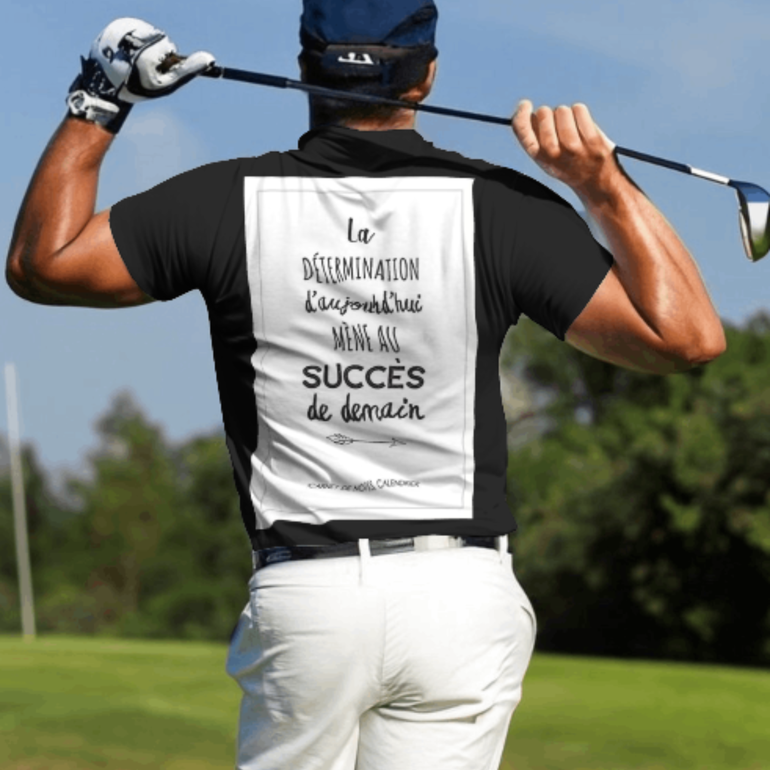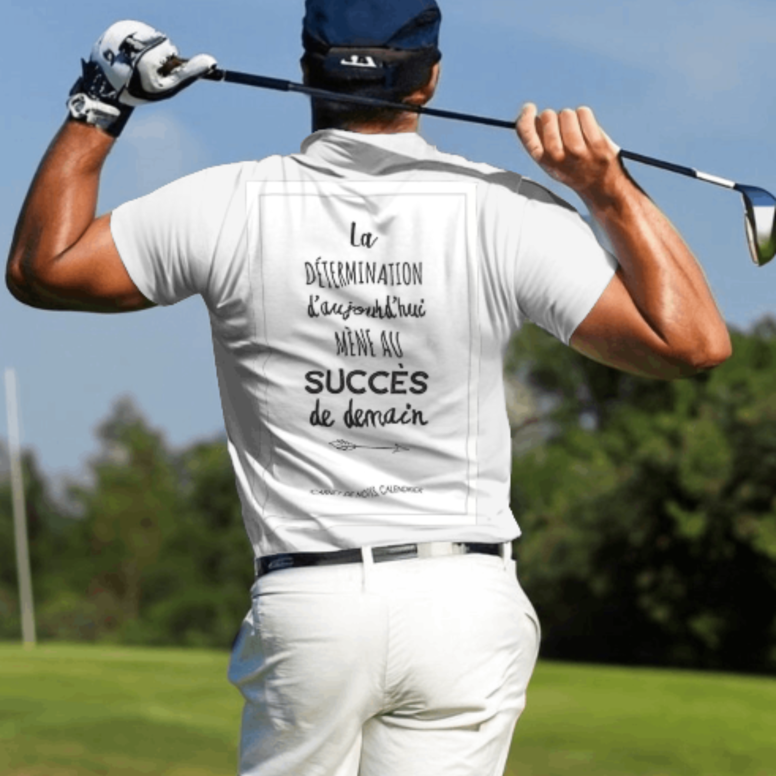 Turn heads on and off the green with this clean white tee, featuring a French motivational quote that reads: