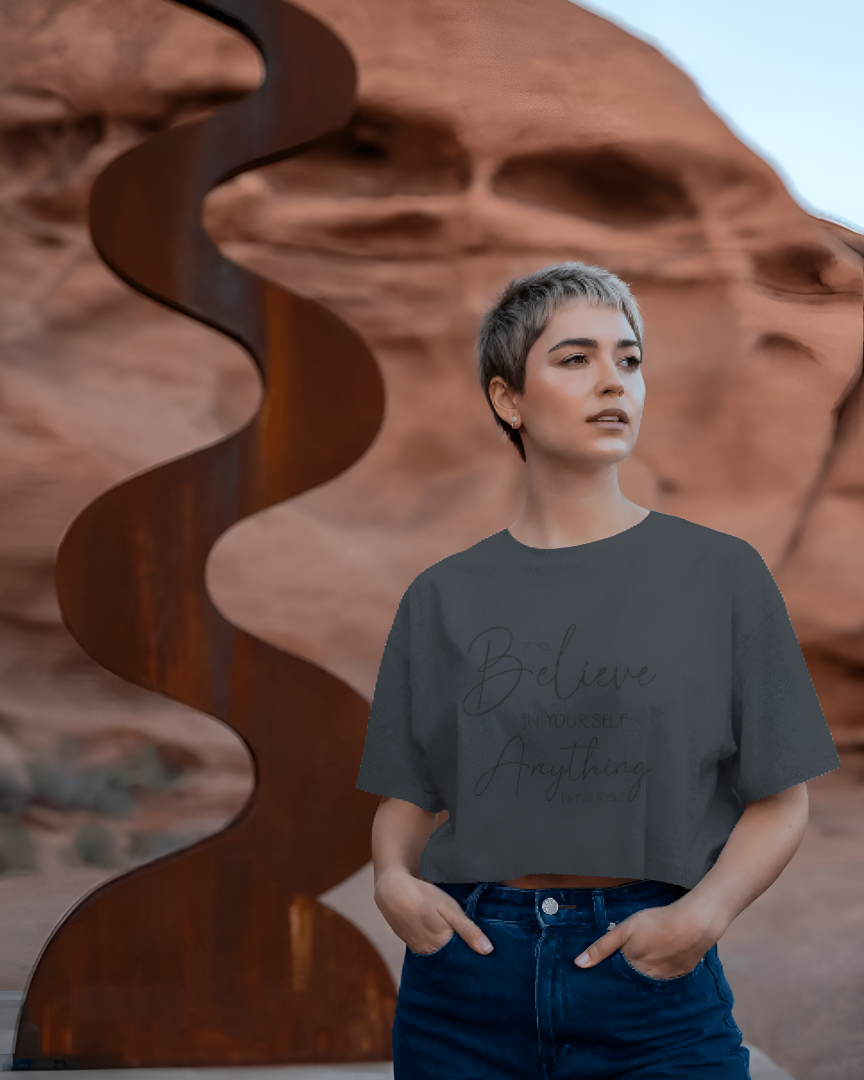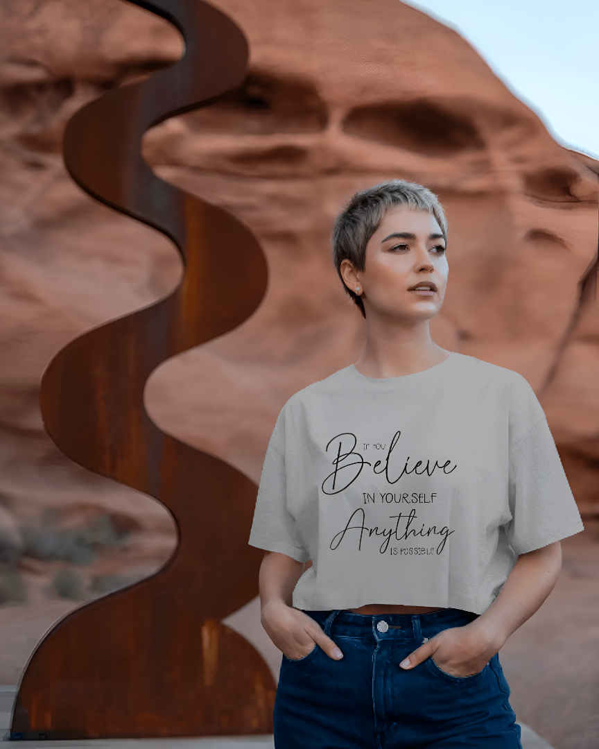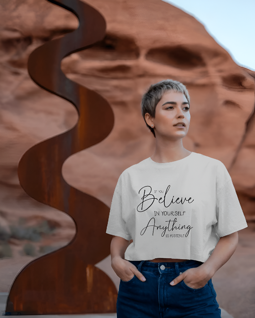 Inspire confidence with this sky-blue tee featuring the empowering quote โIf you believe in yourself, anything is possible.โ in elegant black typography. A perfect daily reminder to stay positive and trust your journey.