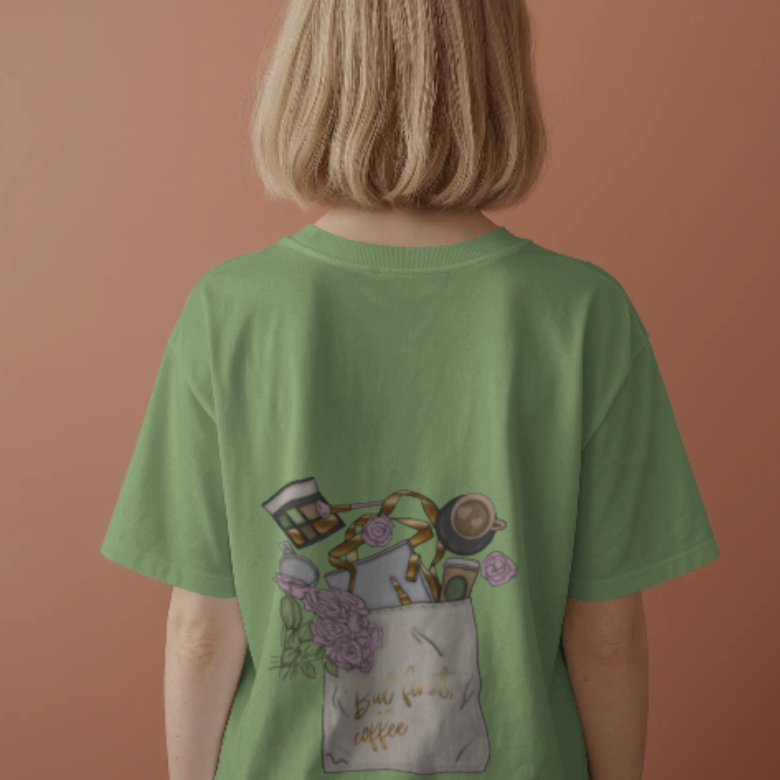Design: Whimsical “But First, Coffee” graphic with a coffee-filled bag and roses