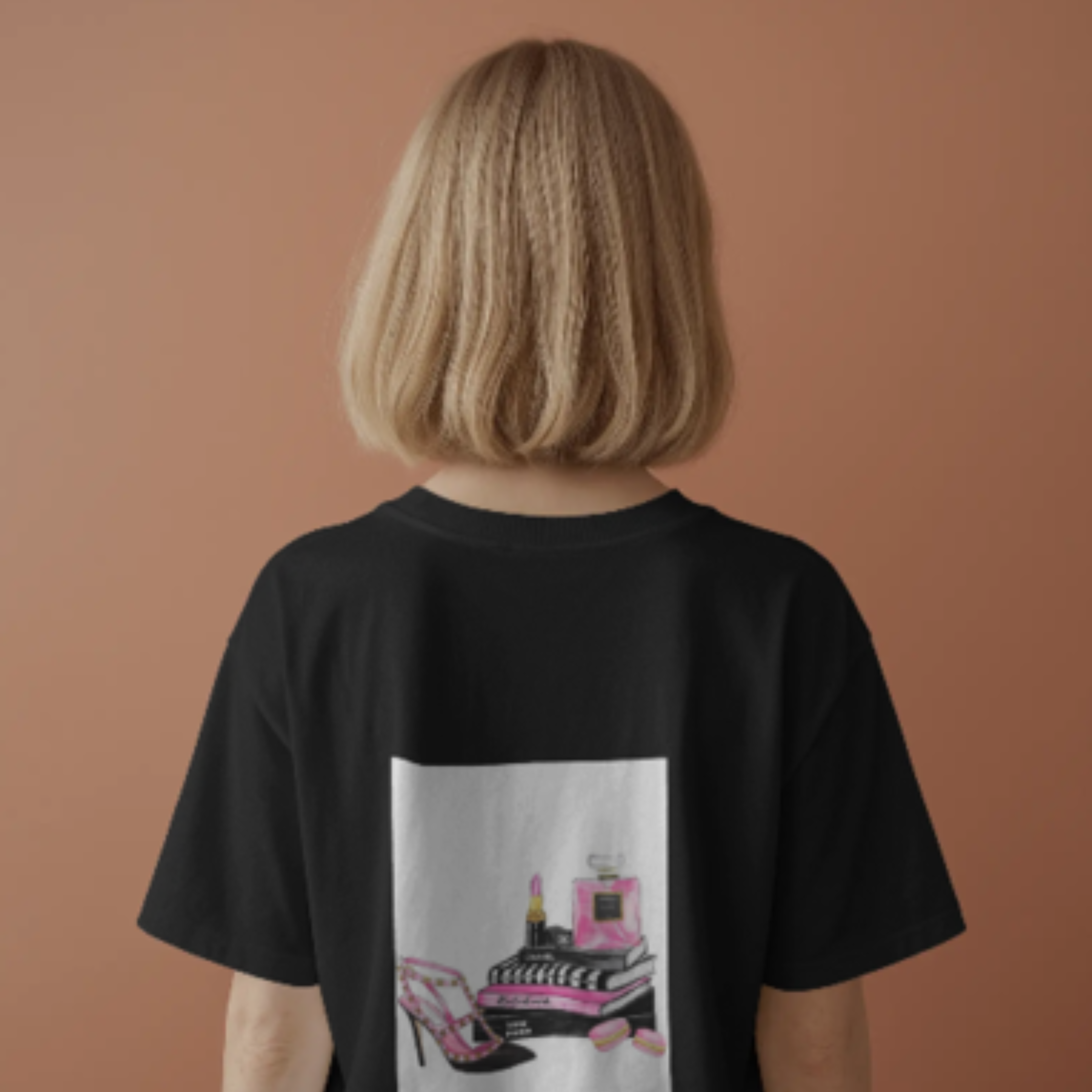 Back: Showcases a glamorous illustrated collage of pink heels, luxe perfume, lipstick, and designer books—a tribute to every fashion lover’s essentials.